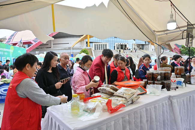 游客们驻足展台购买农特产品。