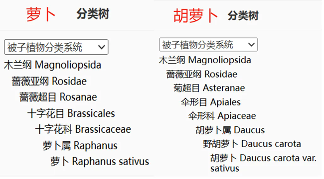 讨论萝卜,首先要把“胡萝卜”拎出来,虽然它俩名字里都带“萝卜”俩字,但胡萝卜却不是萝卜家族的一员。咱们平时说的大萝卜是十字花科萝卜属的植物,而胡萝卜是伞形科胡萝卜属植物。