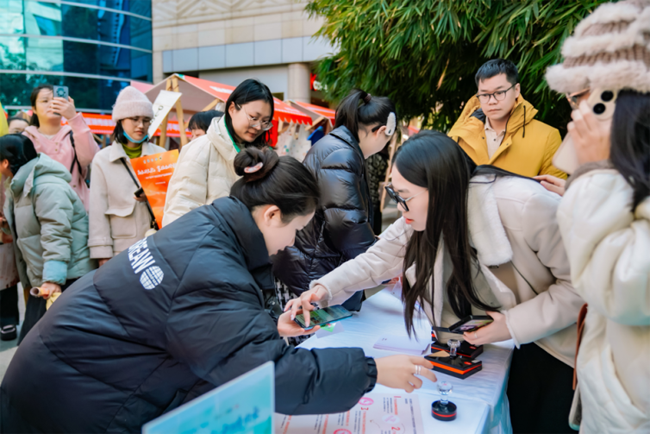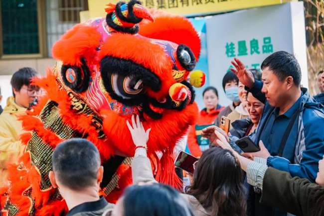 活动现场热闹非凡,各式各样的广西绿色优质农产品年货摊位遍布现场,成为一道道亮丽的风景线。摊位上不仅有独具广西特色的手工新茶饮和令人垂涎的非遗美食,为市民们带来味蕾上的极致享受,还有非遗拓印和写对联等多种活动,让市民们提前感受到浓厚的年味。