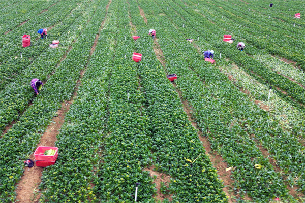 工人正在菜地里采摘。谭海迪摄