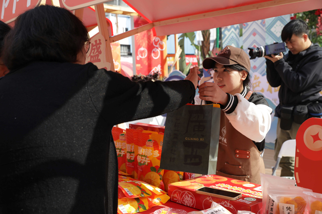 在活动现场,天湖冰芽三江早春茶、全州禾花鱼罐头、崇左小明山古树茶、恭城月柿、梧州六堡茶、壮锦手工包包、陆川猪腊肠,还有广西人过年必备的砂糖橘……各地特色优质农产品琳琅满目,让市民纷纷驻足,流连忘返。这些产品不仅展示了广西丰富的绿色优质农产品资源,也体现了广西农业的多样性和独特性,让市民们在选购年货的同时,也能感受到广西农业的深厚底蕴和文化魅力。