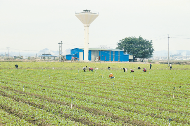 工人们进行拔草和间苗,促进蔬菜健康生长。