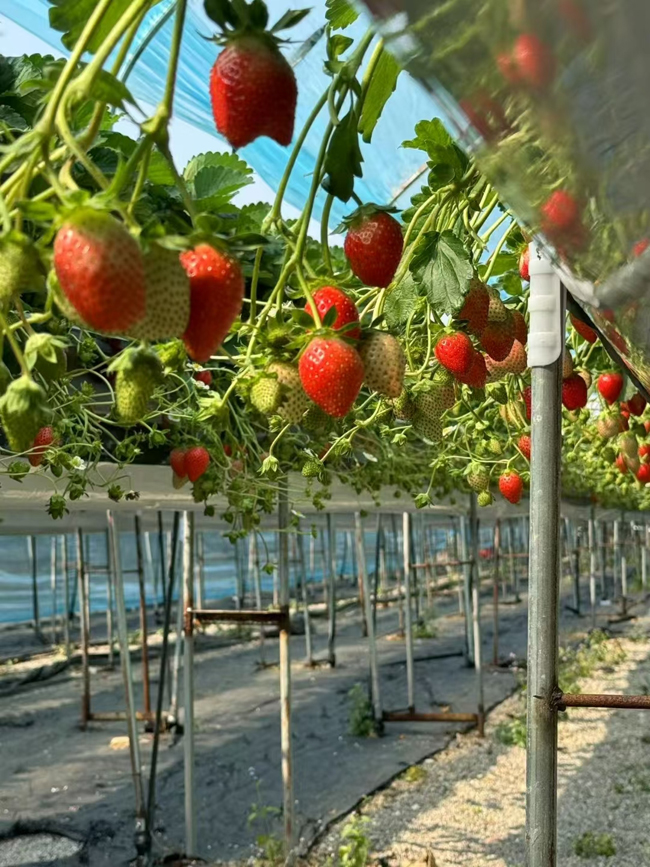 基地采用高架立体种植模式、一体喷灌和无土栽培技术,实现优化和节水节肥。据统计,幸香莓亩产达4000斤,亩产值超8万元。脆蜜哈密瓜亩产约5000斤,亩产值超3万元,较传统模式产量和收入翻倍,大棚年产值提升40%,同时创造10多个就业岗位,为当地居民提供了稳定的收入来源。