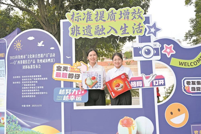 一直以来,咸海鸭蛋是典型的中国特色美食。2015年曾入选“广西最具影响力的十大特产”。2023年10月,“钦州咸海鸭蛋制作技艺”列入第九批自治区级非物质文化遗产代表性项目名录。而该项标准首次对广西非遗技艺产品钦州咸海鸭蛋的术语和定义进行界定,对原辅料、感官、理化指标、净含量、食品安全指标以及标志、包装、运输、销售及储存作出要求。