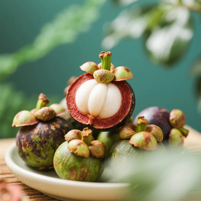 山竹果实具有皮革般的深紫色外皮,厚度约为0.8~1.1厘米,占果实重量的52%~68%;果肉呈白色或白色半透明,为可食部,占整个果实的 29%~45%,吃起来肉嫩汁多,酸酸甜甜,气味宜人,带有果香和花香。