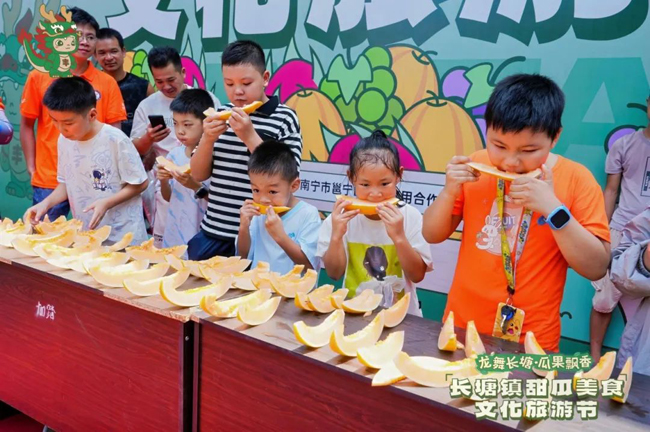 丰收在即,农户脸上笑容如自家瓜瓤般甜润。现场,芭蕉香火龙翻腾起舞,古老鼓点激荡人心,斗竹马的矫健身影腾挪跳跃,引得阵阵掌声传来。随后,“吃瓜大赛”引爆全场热情,小孩组的选手们埋头瓜瓤间汁水四溅,围观者发出助威声浪。“瓜王”评选登场,一颗颗丰硕甜瓜以沉甸甸的姿态角逐,主人骄傲捧起自家金黄甜瓜,宛如托举着土地慷慨的勋章。“我们举办本场活动,想要以此为媒,擦亮长塘镇的瓜果招牌,吸引更多客商到此合作洽谈,市民游客前来体验采摘乐趣,让瓜果飘香的甜蜜事业助农增收。”长塘镇商会会长农作内表示。