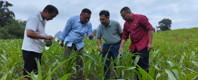 高级农艺师吕国成(左二)带队到种植大户吕德芝(左一)指导秋玉米雨后病虫防治