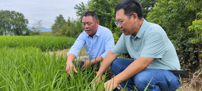 县推广站站长陶尚林(右一)到晚稻种植基地查看苗情