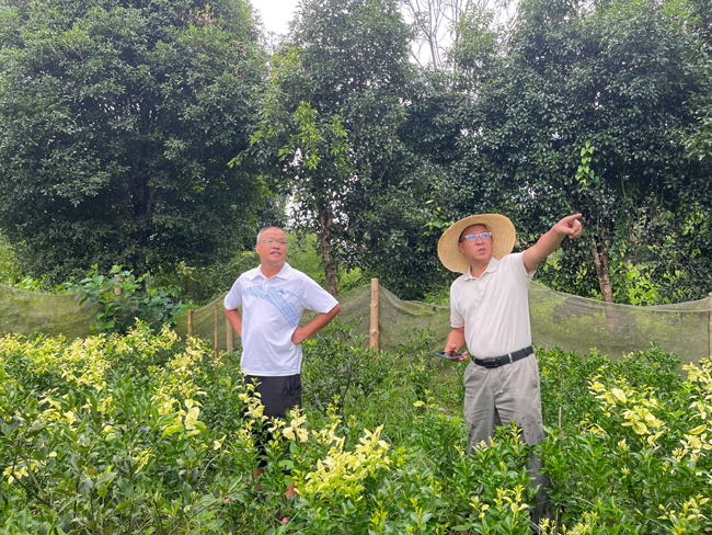高级农艺师李宏辉(左)、甘宁(右)雨后实地查看果树生长情况
