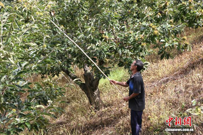 图为栗农正在用竹竿敲打板栗。莫斌 摄