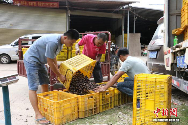 图为栗农正在对板栗进行打包装车。莫斌 摄