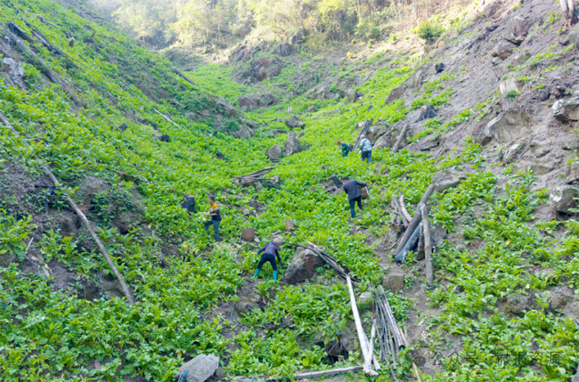 资源县地处桂北山区,平均海拔800米以上,独特的高海拔地理环境造就了昼夜温差大、光照充足、空气洁净等自然优势,加上山泉水灌溉和疏松肥沃的黑土地,成为高山萝卜生长的“天然温室”。山间,几位农户正弯腰忙碌着疏苗作业,他们挽着袖口,指尖轻捻间便将过密的幼苗细心拔除,动作娴熟又轻柔,生怕碰伤身旁长势正旺的萝卜苗。
