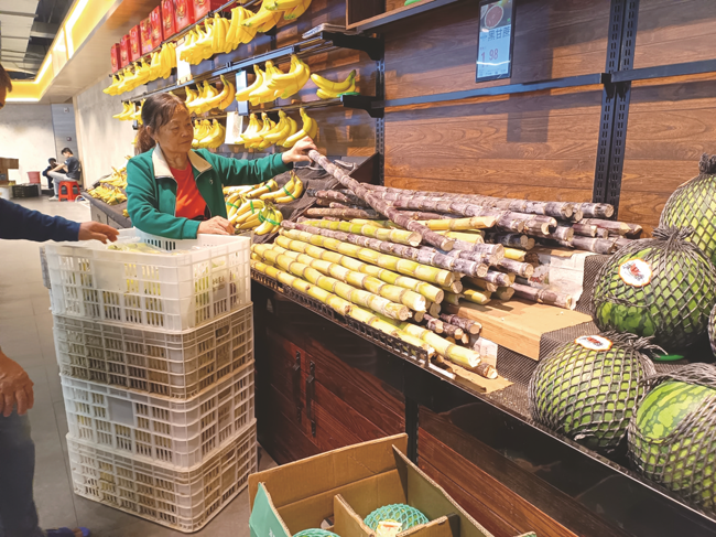 超市里,黄金甘蔗被码放在显眼货架上。记者 韦薇 摄