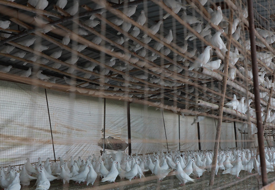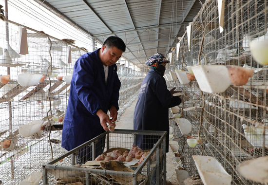 塘步镇大家乐肉鸽养殖示范区内,工作人员正在查看乳鸽生长情况。