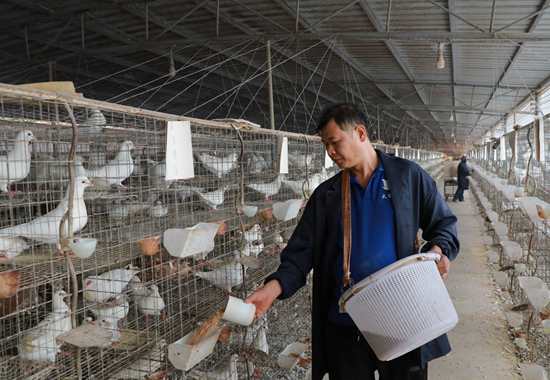 塘步镇大家乐肉鸽养殖示范区,工作人员正忙着喂食