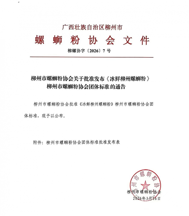 3月16日,柳州市螺蛳粉协会正式发布《冰鲜柳州螺蛳粉》团体标准,于4月1日起实施。此举标志着冰鲜柳州螺蛳粉彻底告别无序发展阶段,迈入标准化、规范化、品质化的新阶段,为柳州螺蛳粉全产业链提质升级注入强劲动能。