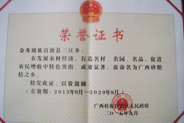 近年来,金秀县三江乡加快转变农业发展方式,积极开发特色优势资源,培育发展“一村一品”,促进农民增收中特色突出,成效显著,于2015年9月被广西壮族自治区人民政府命名为广西砂糖桔之乡。