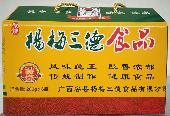 据容县杨梅三德食品有限公司董事长黎勇介绍,“三德豆豉”系列食品全部生产于技术先进的开罐即食自动化生产线,生产线总投资200万元,年产豆豉800多吨,年创产值达5000万元,生产的第一批开罐即食系列豆豉,在2016年海外华侨华人玉林恳亲大会期间全部脱销,赢得海外华侨华人嘉宾交口称赞;“三德豆豉”还是容县旅游特色产品,以其香醇的口味深受消费者喜爱和肯定,产品远销区内外以及港澳台等地区。