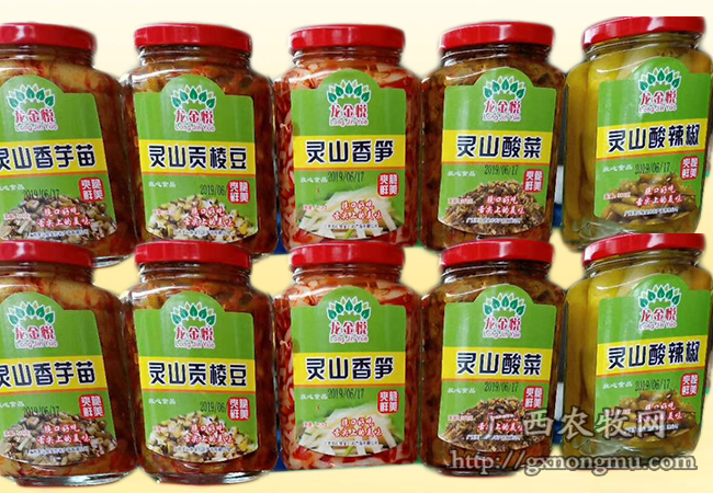 广西灵山县金升农产品有限公司是钦州市重点龙头企业、广西绿色生态农产品优选采购单位,集蔬菜培植、收购、研发、深加工、销售为一体。公司厂房占地面积20多亩,总投资4500万元,可年加工绿色叶菜类8000吨。依托当地独有的资源优势,该公司已发展蔬菜加工制品多年,积累了丰富的加工经验。目前,成功开发出了灵山梅菜、灵山酸菜、灵山大头菜、灵山香笋为代表的“灵”字头四大系列30多个产品,其中龙金悦系列产品成为了市场行业的新标杆,产品畅销全国各地,并打入了香港市场。