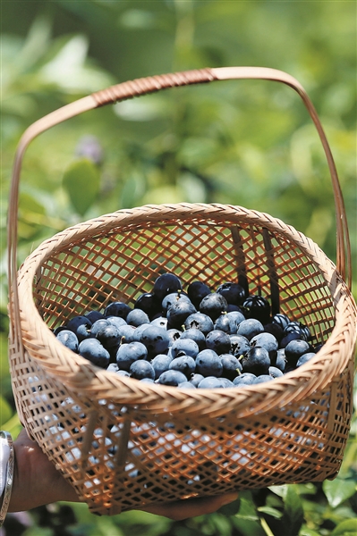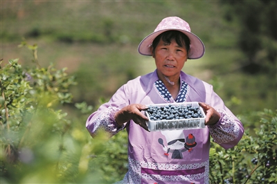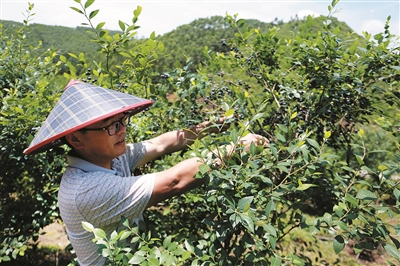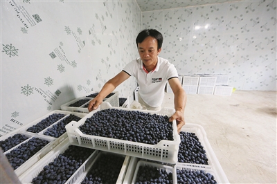韦云善在蓝莓园内采摘蓝莓