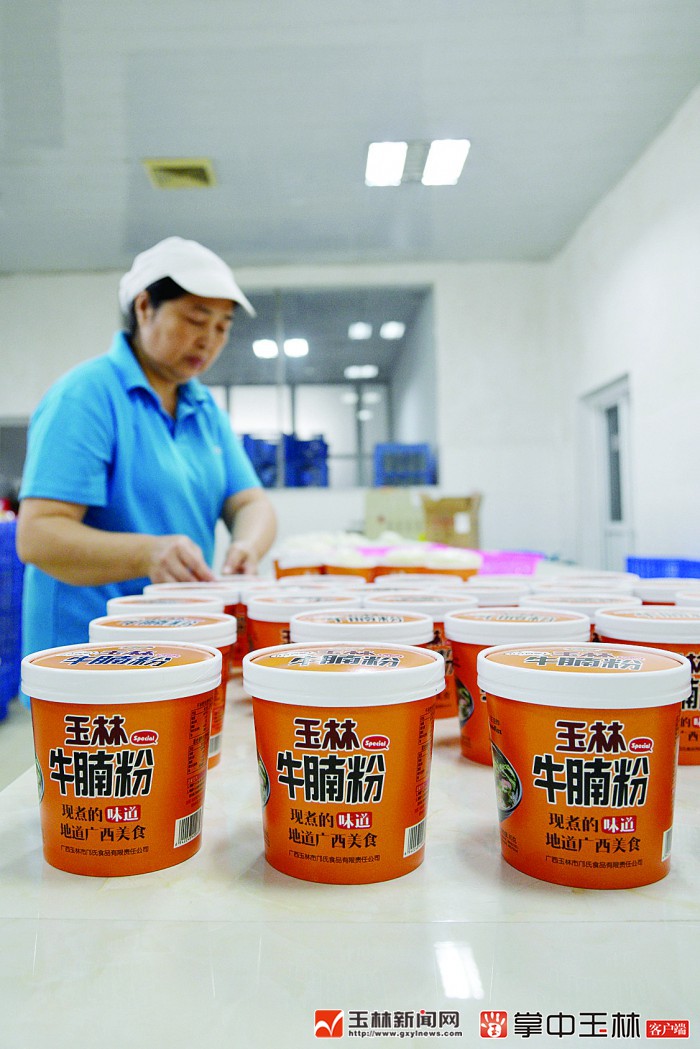 在玉林一家食品企业的生产车间里,工人正在包装桶装牛腩粉。