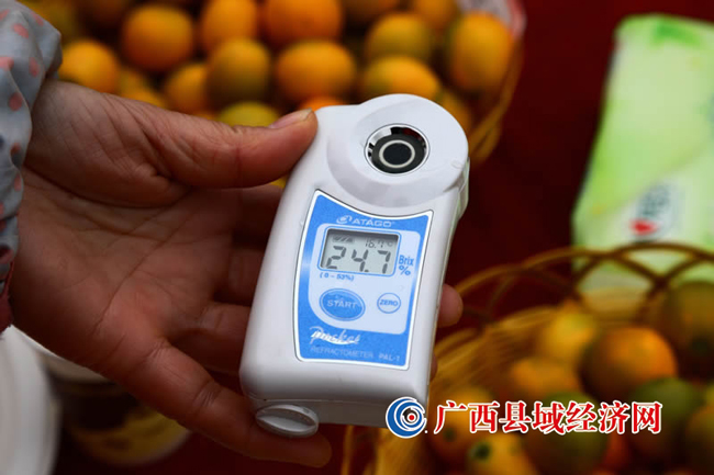 12月8日,在融安县大将镇三马屯举办的“我是融安金桔王”擂台赛初赛现场,评委用检测仪测量出某颗金桔甜度达24.7度。(韦胜耀 摄)