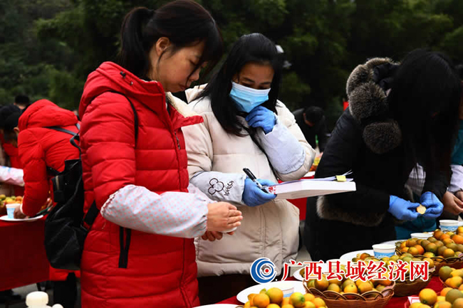 12月8日,在融安县大将镇三马屯举办的“我是融安金桔王”擂台赛初赛现场,评审工作人员在对参赛金桔进行评比打分。(韦胜耀 摄)